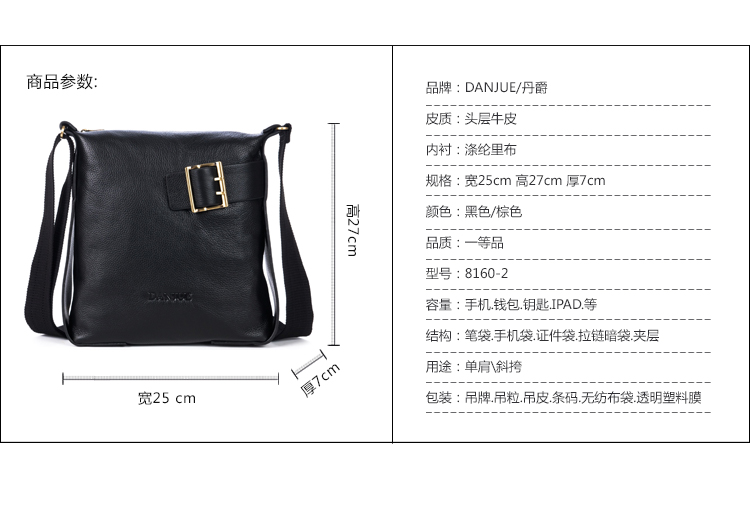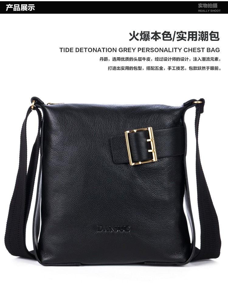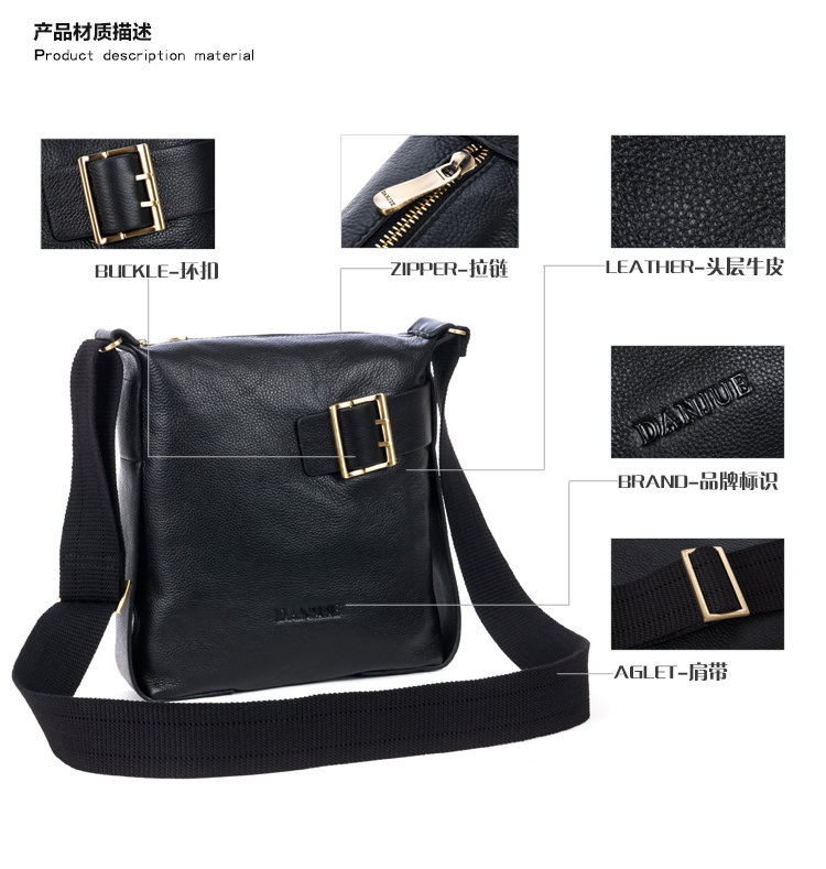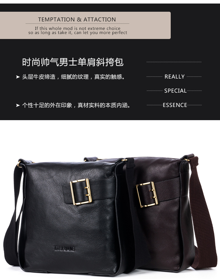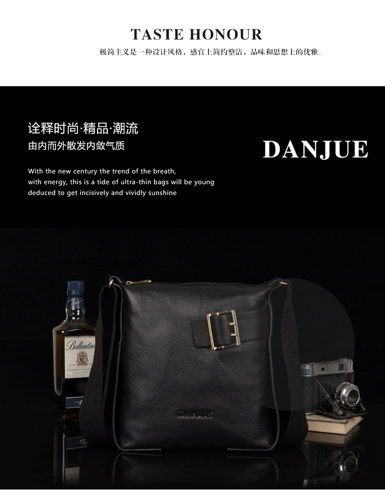 【DANJUE 丹爵 头层牛皮 男士单肩包 休闲斜挎包 商务公文包 真皮男士包 2016新款 D8160-2黑色均码】