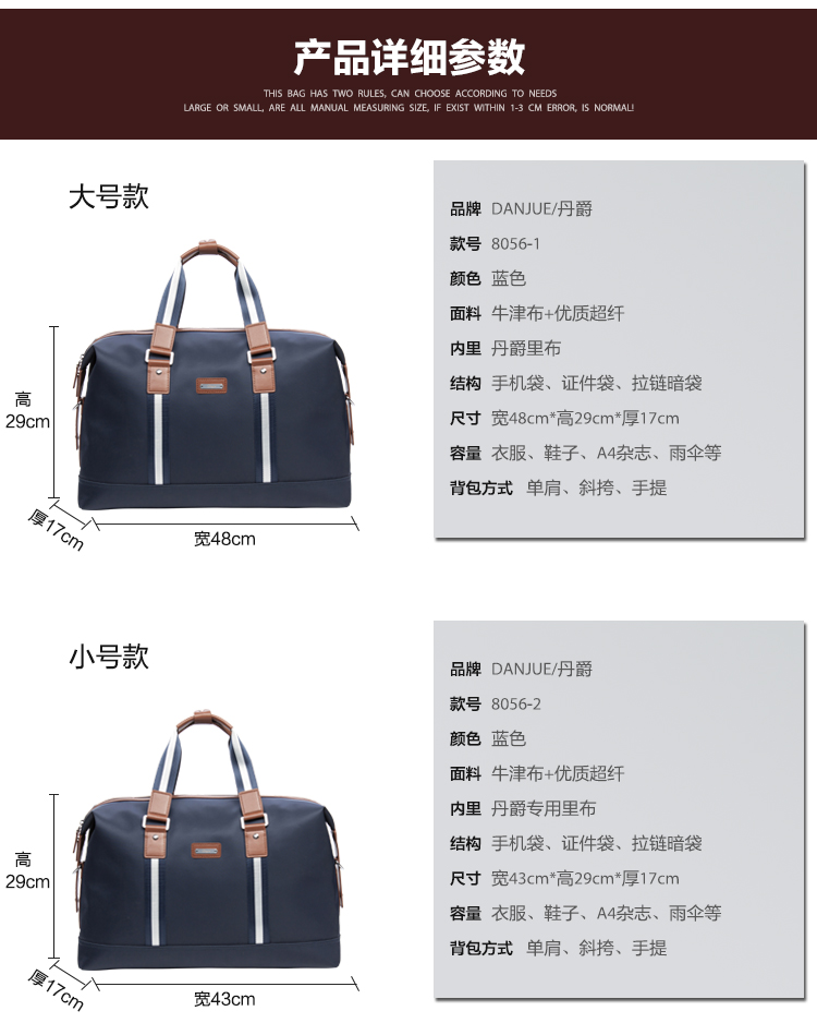 网站首页 【DANJUE 丹爵 旅行包男女商务出差行李包单肩短途行李袋单肩斜跨行李箱多功能男包8056-1-2蓝色大号】 售价: ¥259+36美金币 已售: 4536 评价: 次评价 微信扫一扫轻松购买 数量: − + 收藏 保障: 随时退 过期退 极速退 真实评价
