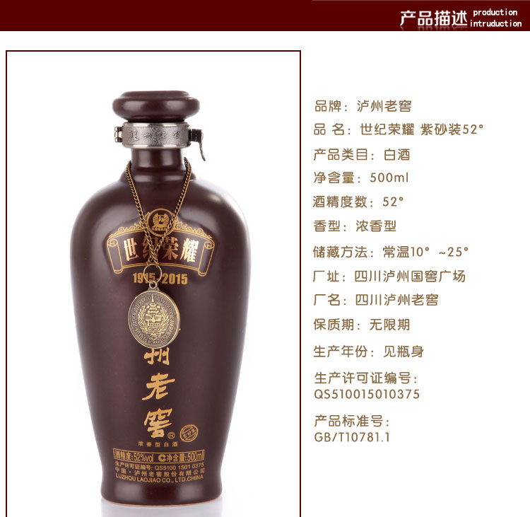 【泸州老窖世纪荣耀52度500ml紫砂装浓香型白酒】