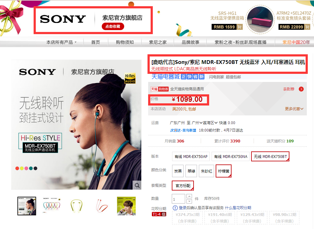 网站首页 【[鹿晗代言]Sony/索尼 MDR-EX750BT 无线蓝牙 入耳/耳塞通话 耳机】 售价: ¥1099+109美金币 已售: 5641 评价: 次评价 微信扫一扫轻松购买 数量: − + 收藏 保障: 随时退 过期退 极速退 真实评价