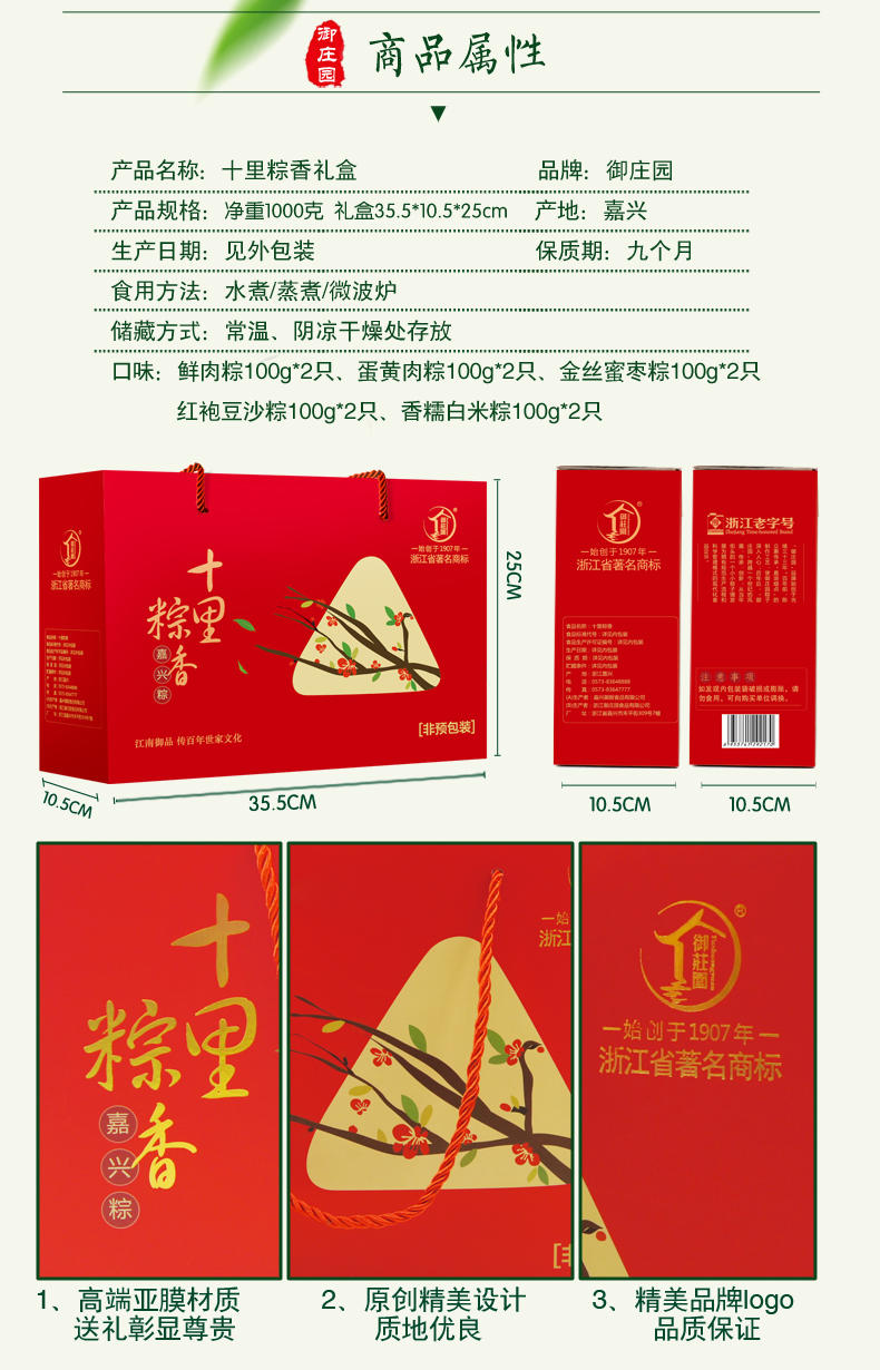 【御庄园粽子礼盒装 鲜肉粽蛋黄粽100g*10只】